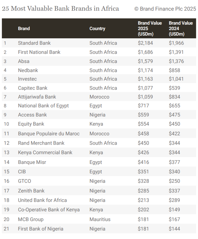 Despite these impressive gains, no African banking brands make the Top 100 due to weak domestic currencies and high regional risk. The highest-ranking African brands are all from South Africa, with Standard Bank at 134 (up four places since 2024), First National Bank at 158 (up 11 places since 2024) and Absa Bank at 170 (up two places since 2024).