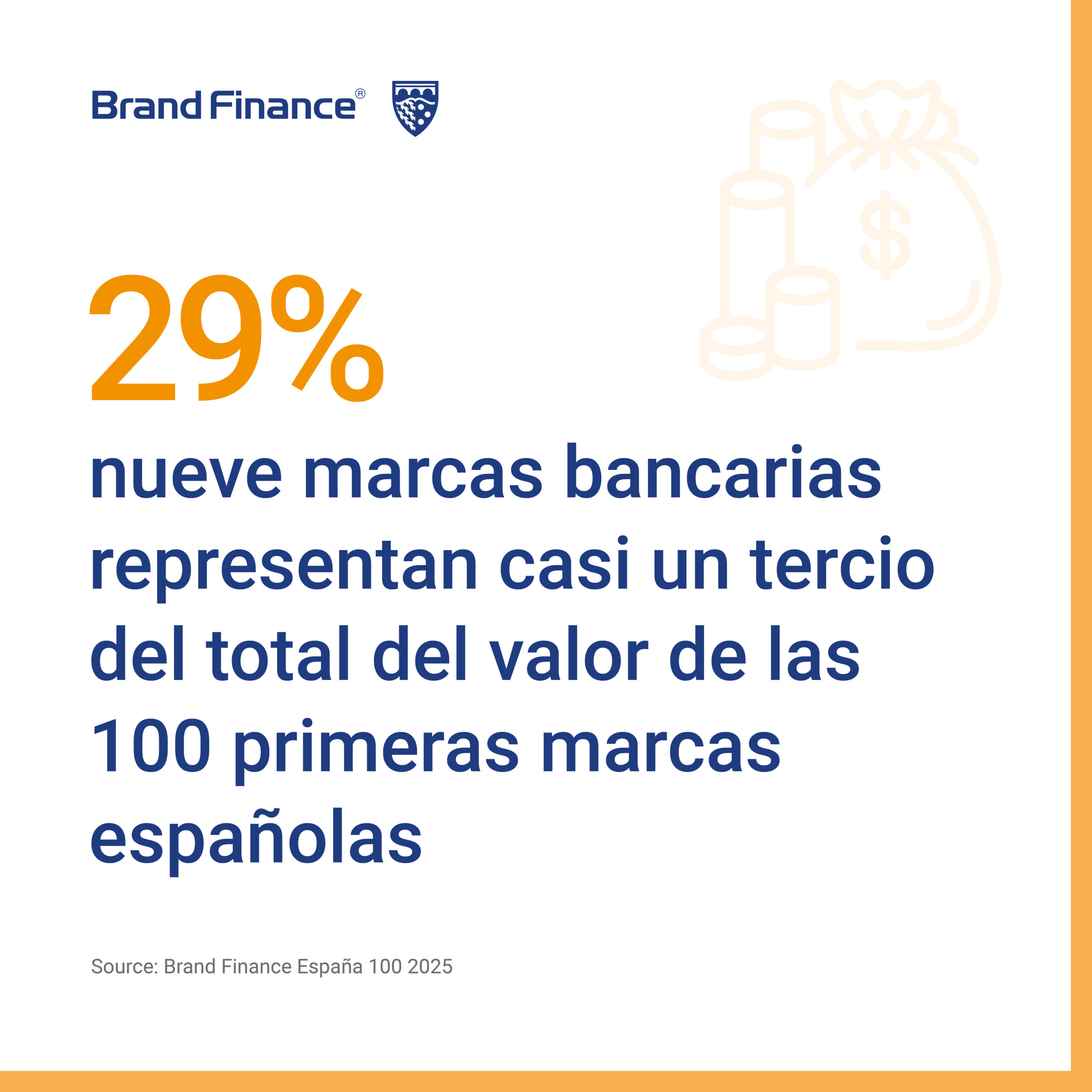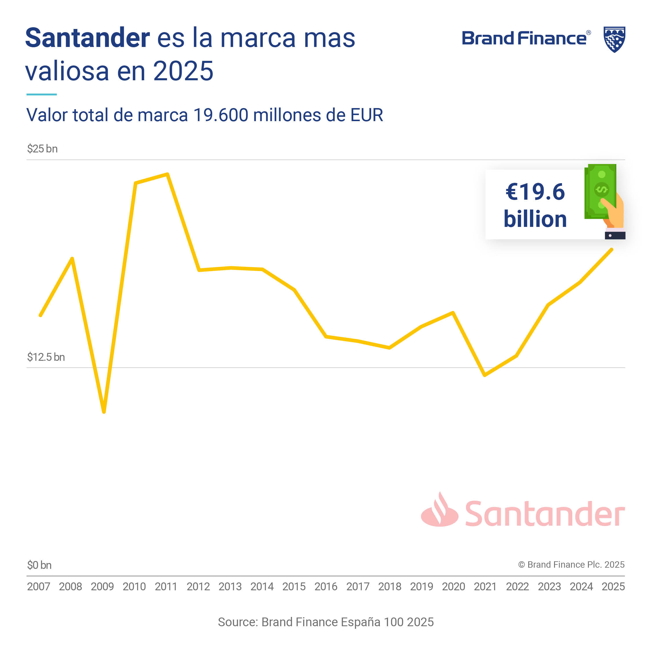 “El sector bancario es el que más contribuye a las 100 marcas españolas más valiosas, con nueve bancos que representan el 29% del valor total del ranking, lo que equivale a 38.800 millones de euros. Esto supone un aumento del 16% con respecto a 2024. El banco Santander se mantiene en la primera posición del ranking como la marca española más valiosa rozando los 20 mil millones de euros”.