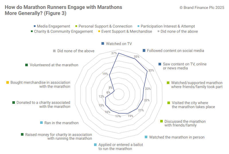 Despite high engagement through media and direct participation, areas like buying merchandise (7%) and volunteering at events (5%) see much lower levels of engagement amongst spectators and non-runners who engage with the marathon. This gap presents an untapped opportunity for organisers and sponsors to enhance involvement. Offering exclusive merchandise deals or integrating products into charity initiatives could drive sales, while positioning volunteering as a meaningful way to give back and experience the event firsthand could boost participation. Strengthening these engagement channels could create a more immersive marathon experience for runners and supporters alike.