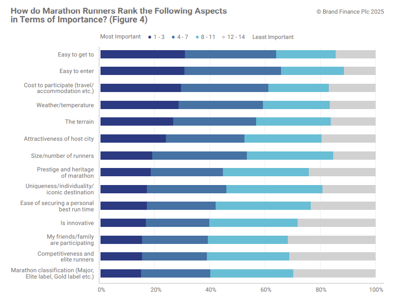 While factors like prestige and uniqueness — such as the heritage of a marathon (important to 18% of runners) and iconic destinations (17%) — hold some appeal, they are less critical than practical considerations like accessibility. Similarly, competitive elements, including the presence of elite runners and marathon classification, rank lower in importance, with only 15% of marathon runners listing them among their top three priorities.