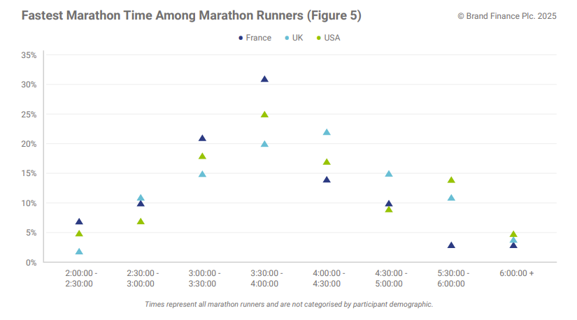 UK runners are more likely to fall into slower time brackets, with a higher proportion finishing between 4 to 5 hours than their counterparts in France and the USA. This trend likely reflects the significant charitable participation in UK marathons, where many runners, not necessarily seasoned athletes, participate for charity purposes.
