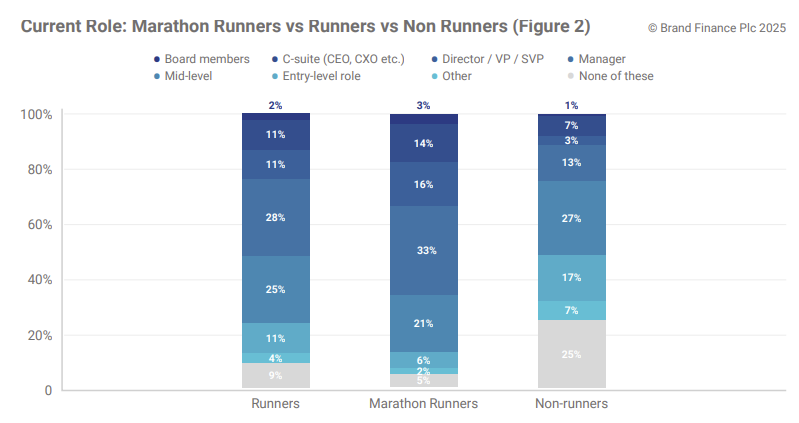 The most common role for both runners and marathon participants is managerial, with marathon runners represented at 33% compared to 28% of general runners. This higher proportion of marathon runners in managerial positions likely reflects the personal qualities honed through marathon training—time management, discipline, and motivation—skills that align well with effective leadership.