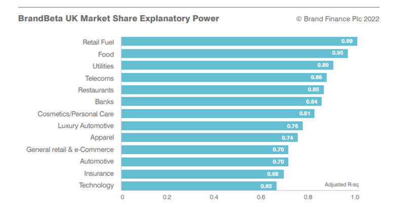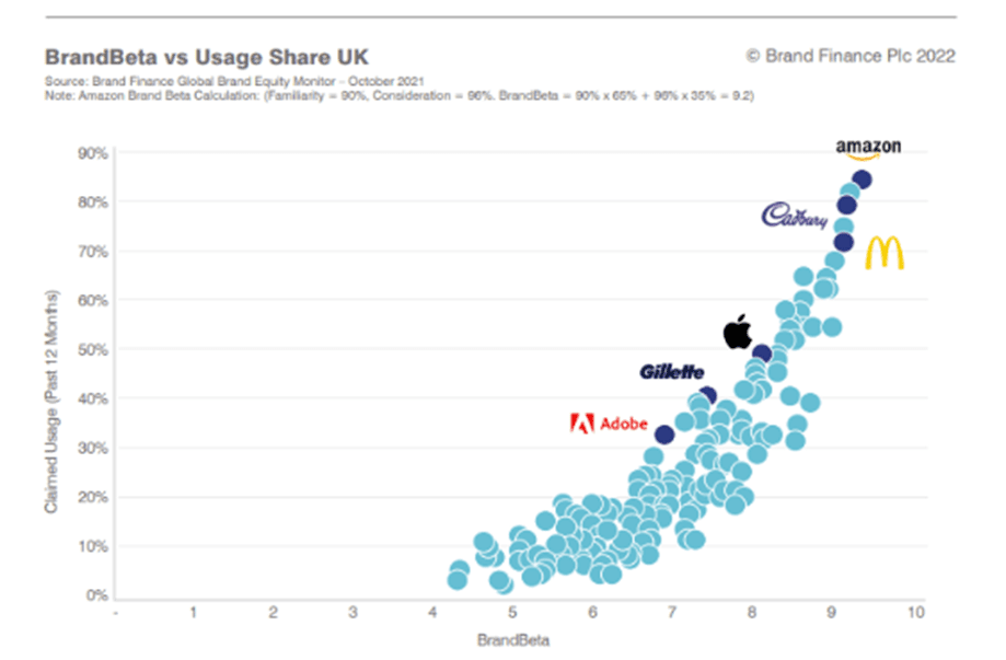 This model is called the BrandBeta® and is calculated as a combination of brand familiarity and consideration conversion, being the proportion of people familiar with a brand who are willing to consider it. The BrandBeta® model is highly predictive of share.