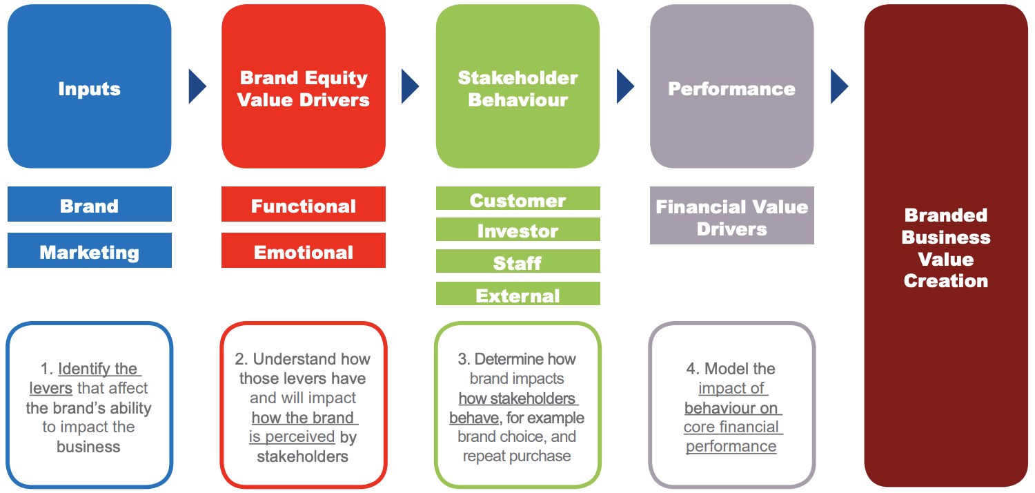 Our conceptual framework for brand evaluation is intended to identify the links between actions/investments and the awareness, perceptions, and stakeholder behaviour that they cause. While the levers, as well as the drivers of brand preference, differ by sector, the overarching idea is seen in this graph.