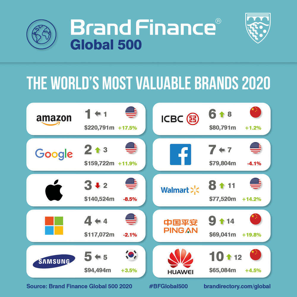 În fiecare an, compania de consultanță și evaluare de brand Brand Finance evaluează cele mai valoroase branduri globale. Primele 500 dintre acestea sunt incluse în raportul anual Brand Finance Global 500 2020.