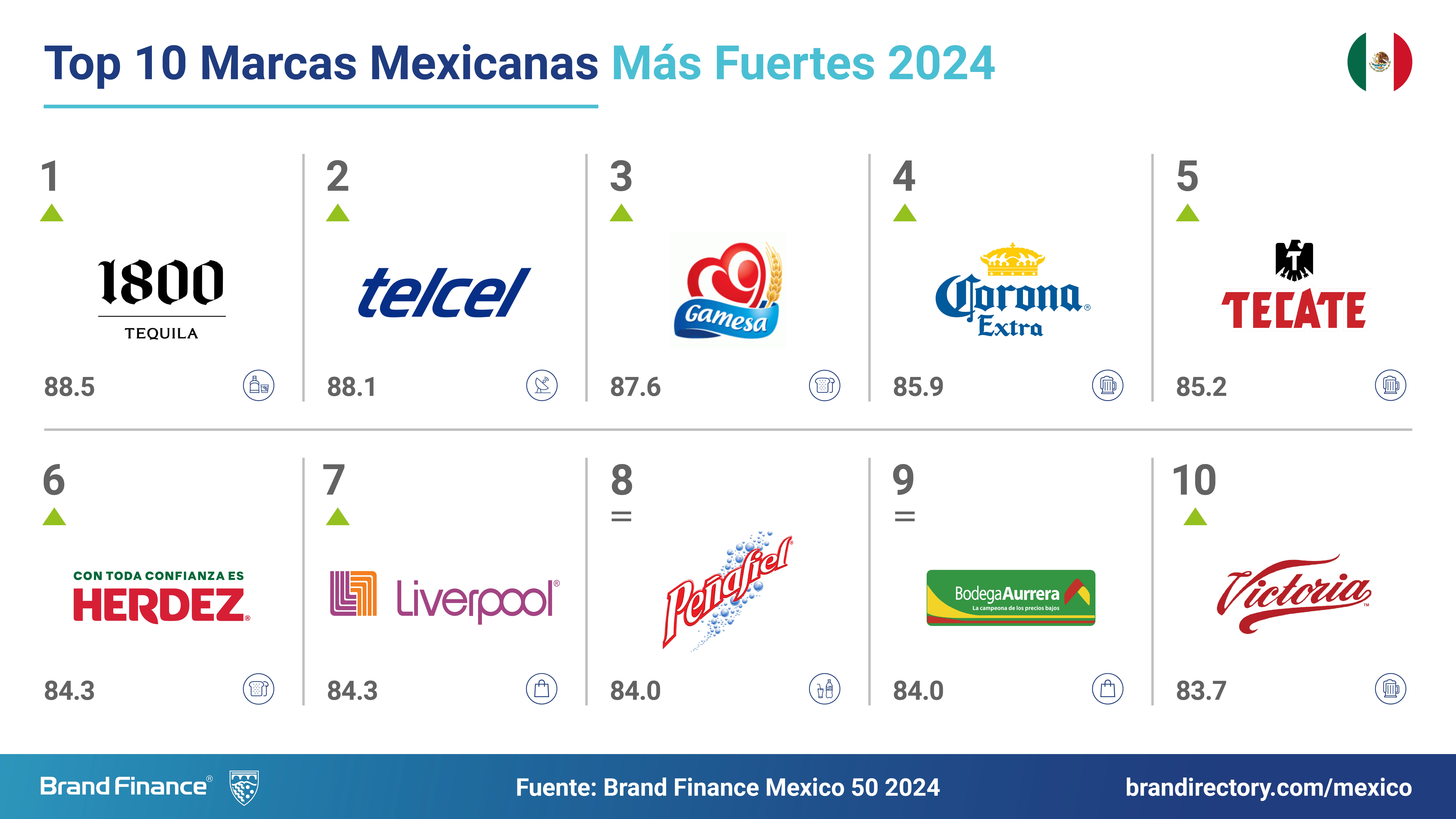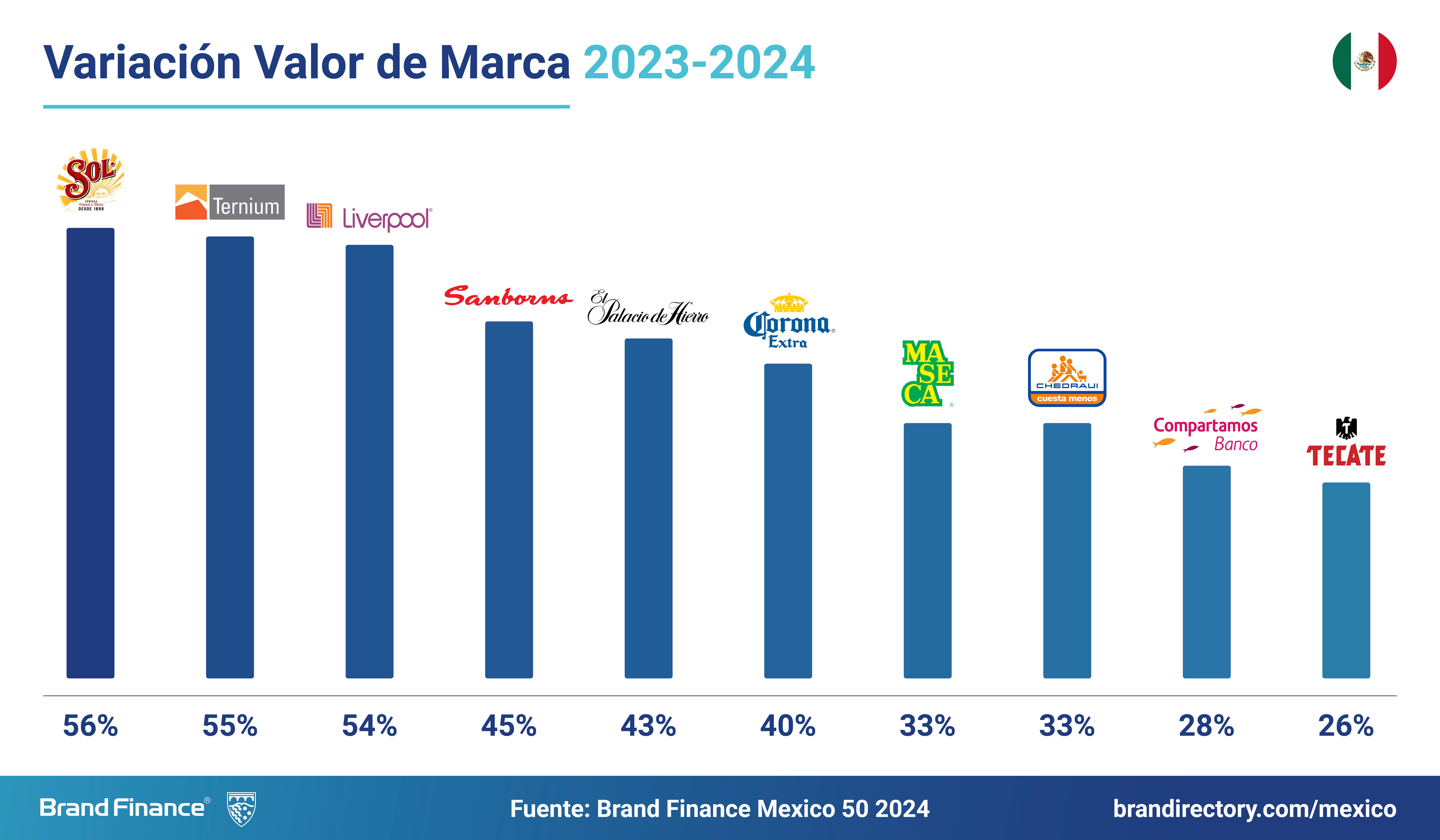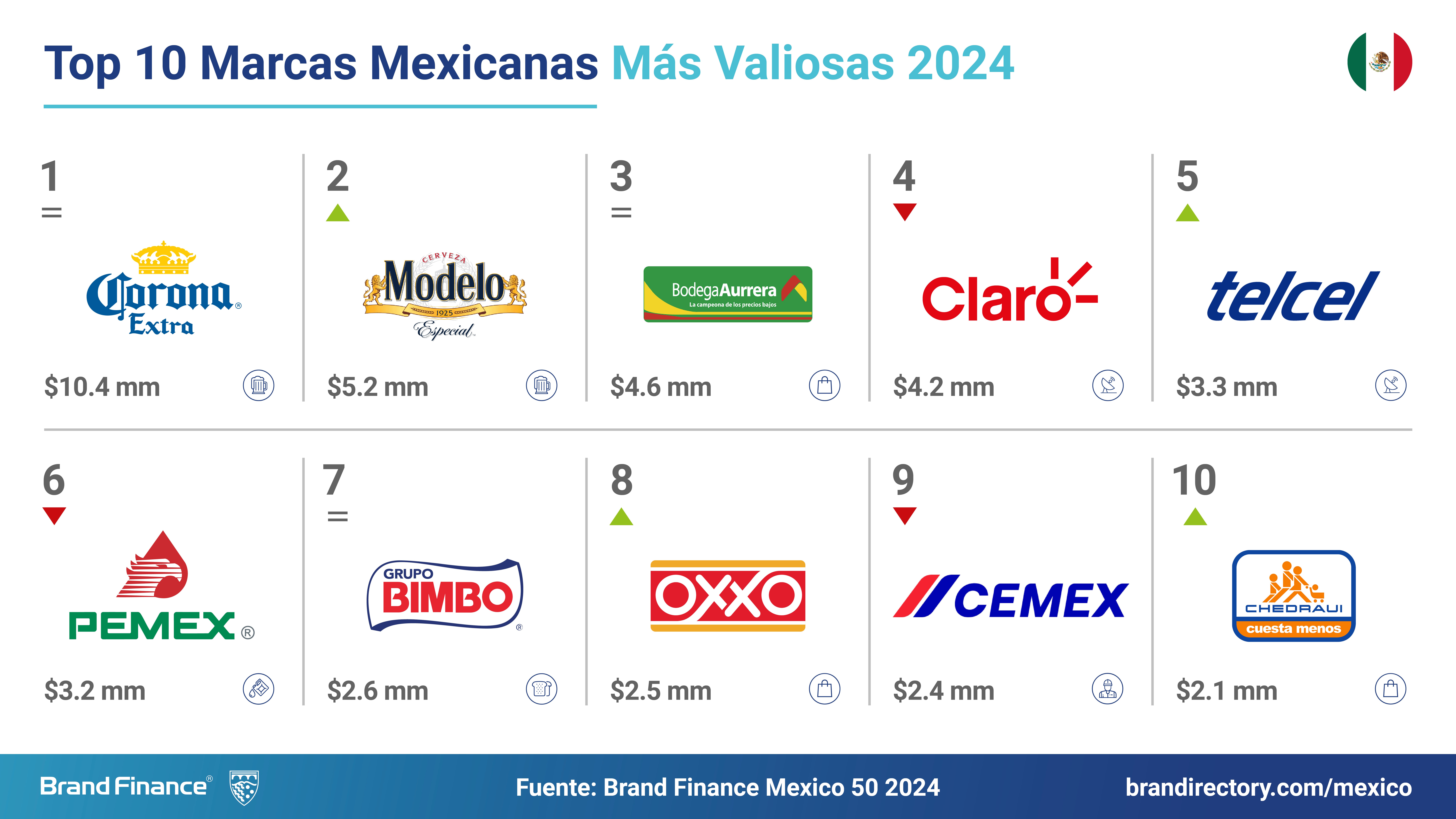 El ranking anual Brand Finance México 50 2024, evalúa las 50 marcas más valiosas y fuertes del país. Las 50 marcas más valiosas de México suman un total de USD68.6 mil millones, un 13% más que en 2023. Solo 18 de las 50 marcas superan los USD1,000 millones en valor de marca y 23 tienen presencia internacional confirmada.