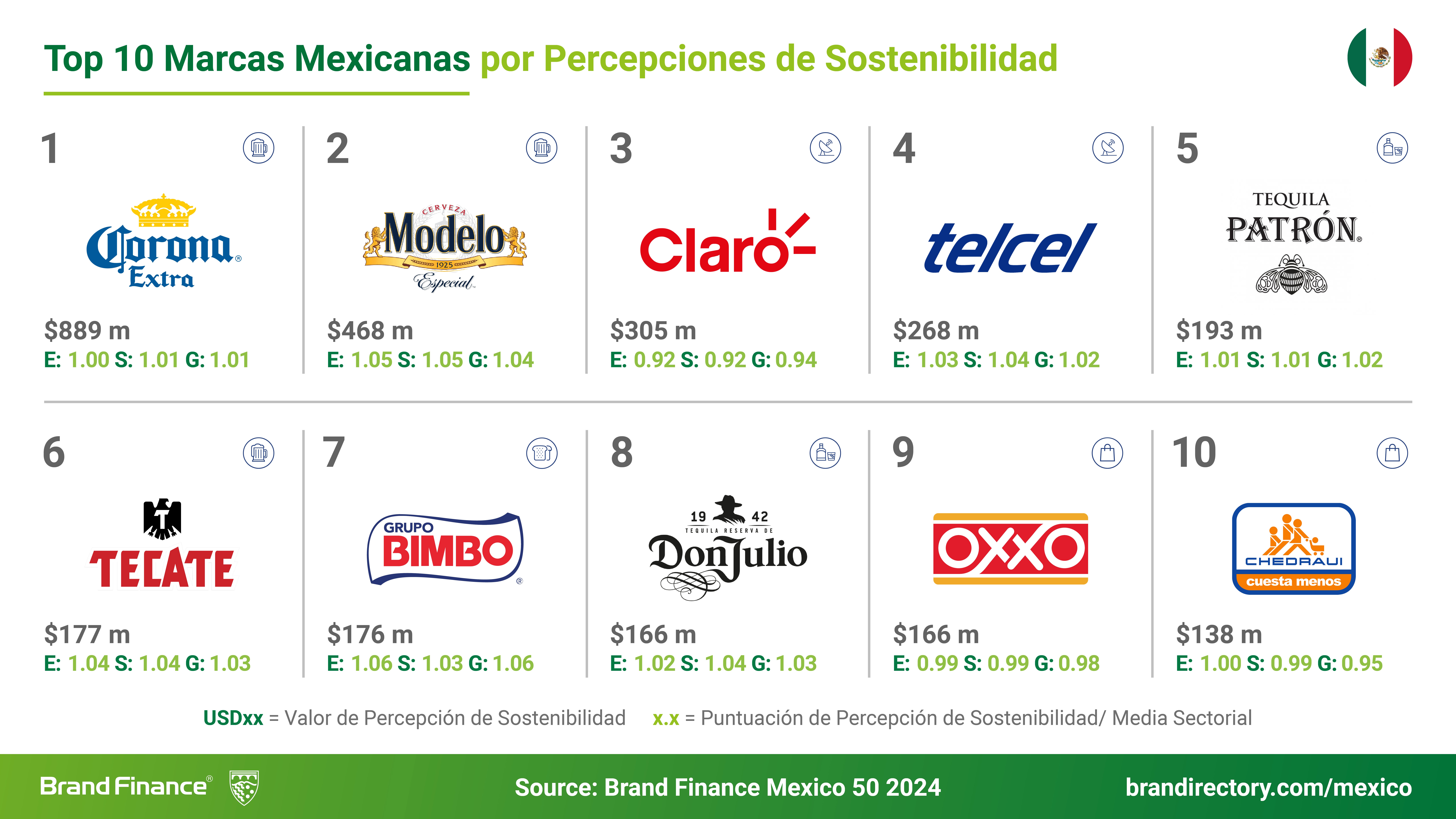 Corona Extra, Modelo Especial y Claro son las marcas mexicanas con mayor Valor de Percepción de Sostenibilidad. Corona Extra lidera con un valor de percepción de sostenibilidad (SPV) de USD889 millones, seguida por Modelo Especial con USD468 millones y Claro con USD305 millones.