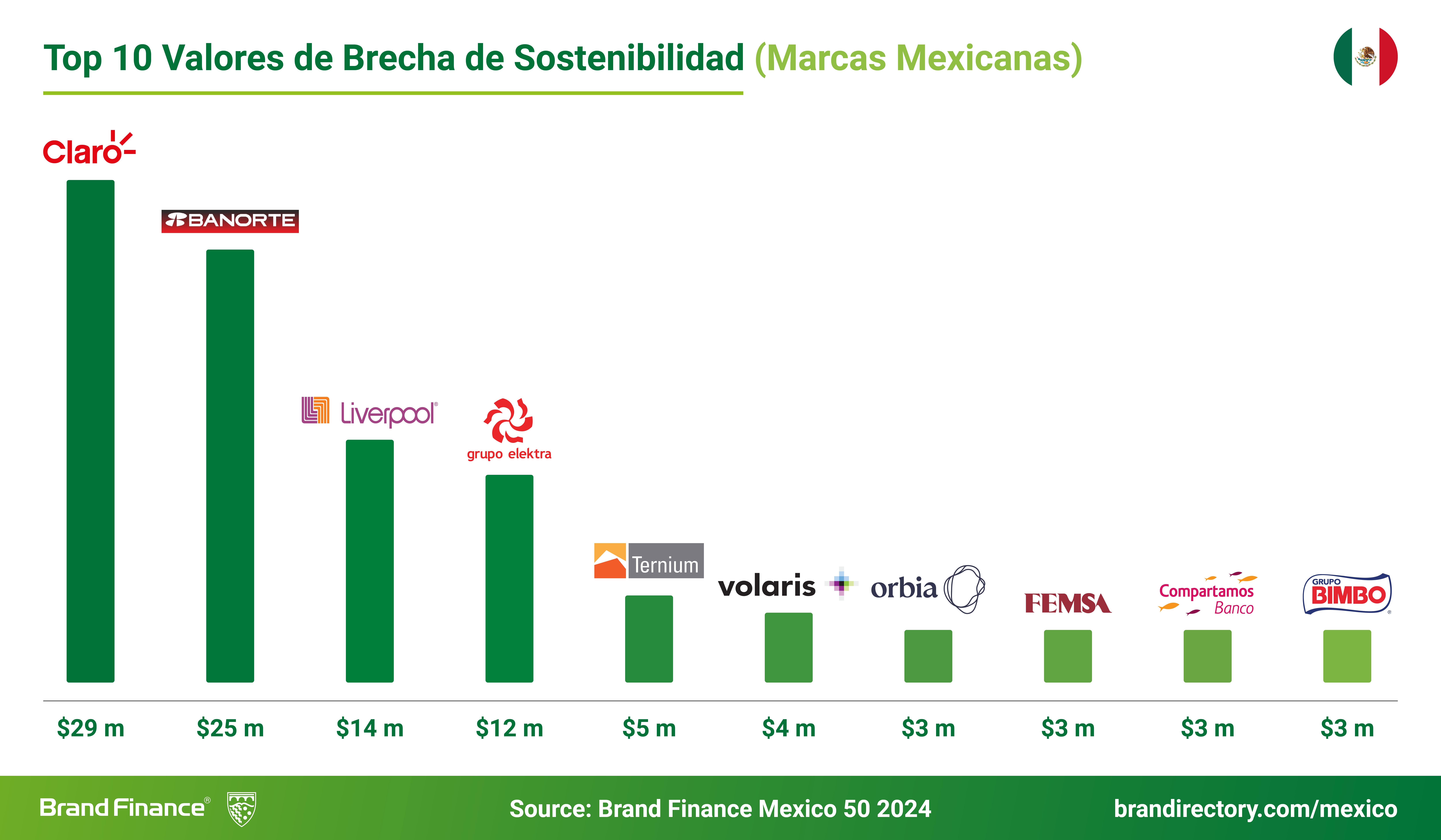 Sin embargo, algunas marcas enfrentan desafíos en la comunicación efectiva de sus esfuerzos de sostenibilidad. Claro, Banorte y Liverpool presentan los mayores valores de brecha de sostenibilidad, lo que indica que podrían ganar más valor con una mejor comunicación en este ámbito.