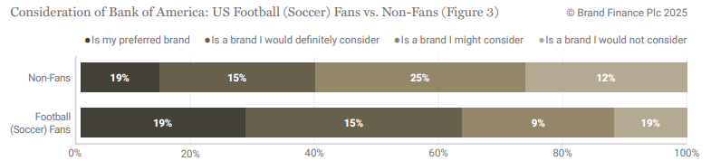 US football (soccer) fans are 19% more likely to consider Bank of America as their banking brand (Figure 3), whilst the increase is higher among women football (soccer) fans at 20%.