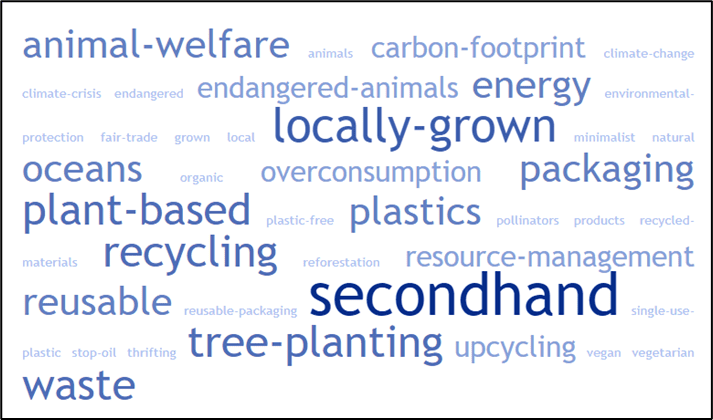 When asked about the sustainability issues most important to them (Figure 1), respondents focused on topics relevant to Food and Apparel. This is intuitive, given that these brands and products tend to be highly visibile to consumers. Respondents mentioned low-and no-waste packaging, locally made products, and organic items when discussing food, and when talking about apparel, they name-checked circularity, sustainable materials, and secondhand shopping.