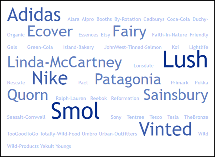 Naturally, customers perceive brands that promote iniatives related those those themes as committed to sustainability and aligned with their own values. Although Food and Apparel brands were mentioned in this context (Figure 2), customers also cited personal care and household product brands. Sustainability is central to Lush’s messaging and the company has a track record of activisim that is tied to the products they sell, including but not limited to animal rights, reduced packaging, and transparent product formulas. Household cleander brand Ecover also leverages messaging focused on clean product ingredients by touting associated health benefits, while Smol echos the call for less plastic waste and packaging. All three brands notably use the term ‘revolutionary’ to describe themselves and the role they champion towards mainstreaming lower-waste, health-conscious products and raising consumer awareness.