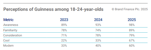 In line with rising demand, Brand Finance research reveals a notable shift in consumer perception and engagement between 2023 and 2025. Awareness, consideration, and perception have all seen significant gains. Further, Brand Finance research also shows that Guinness has gained significant traction among younger consumers (18-24), noting a marked shift in perceptions of the brand as ‘cool’ (22% in 2023 versus 67% in 2025) and ‘modern’ (33% in 2023 versus 60% in 2025), positioning it well for future brand growth (see table).