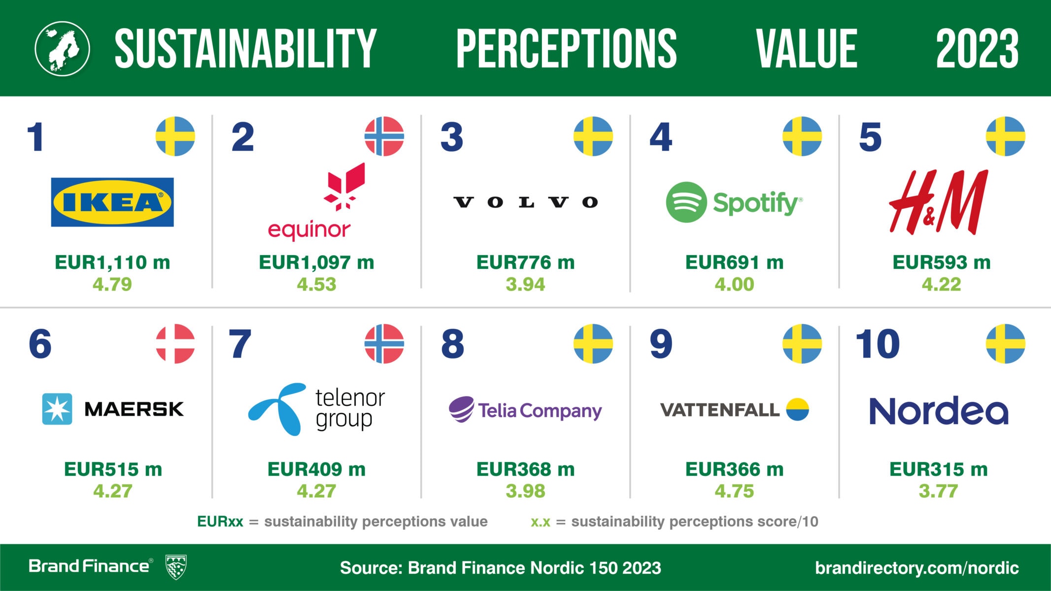 Food brand Valio (brand value up 13% to EUR1.4 billion) has the highest Sustainability Perceptions Score in the ranking - 6.4 out of 10. As Finland’s biggest exporter of food products, Valio has sustainability at the forefront of its communication with stakeholders.
