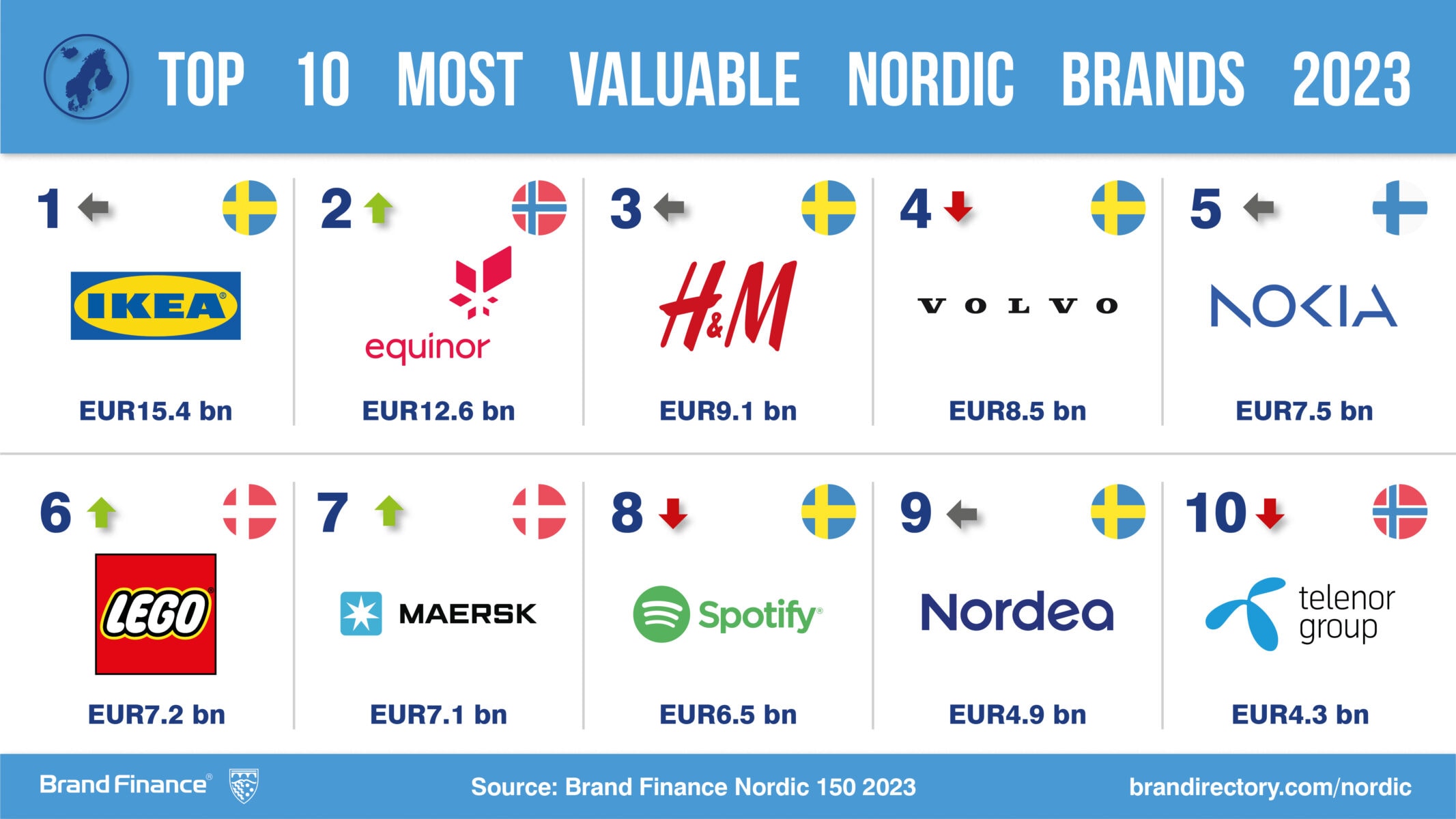 IKEA (brand value up 2% to EUR15.4 billion) has continued on its unbroken run as the most valuable Nordic brand, according to the new Nordic 150 2023 report from Brand Finance, the world’s leading brand valuation consultancy. Fellow Swedish brand, Volvo (brand value down 31% to EUR8.5 billion) drops two positions in the ranking, paving the way for Norwegian Oil & Gas giant Equinor (brand value up 57% to EUR12.6 billion) to take second place.
