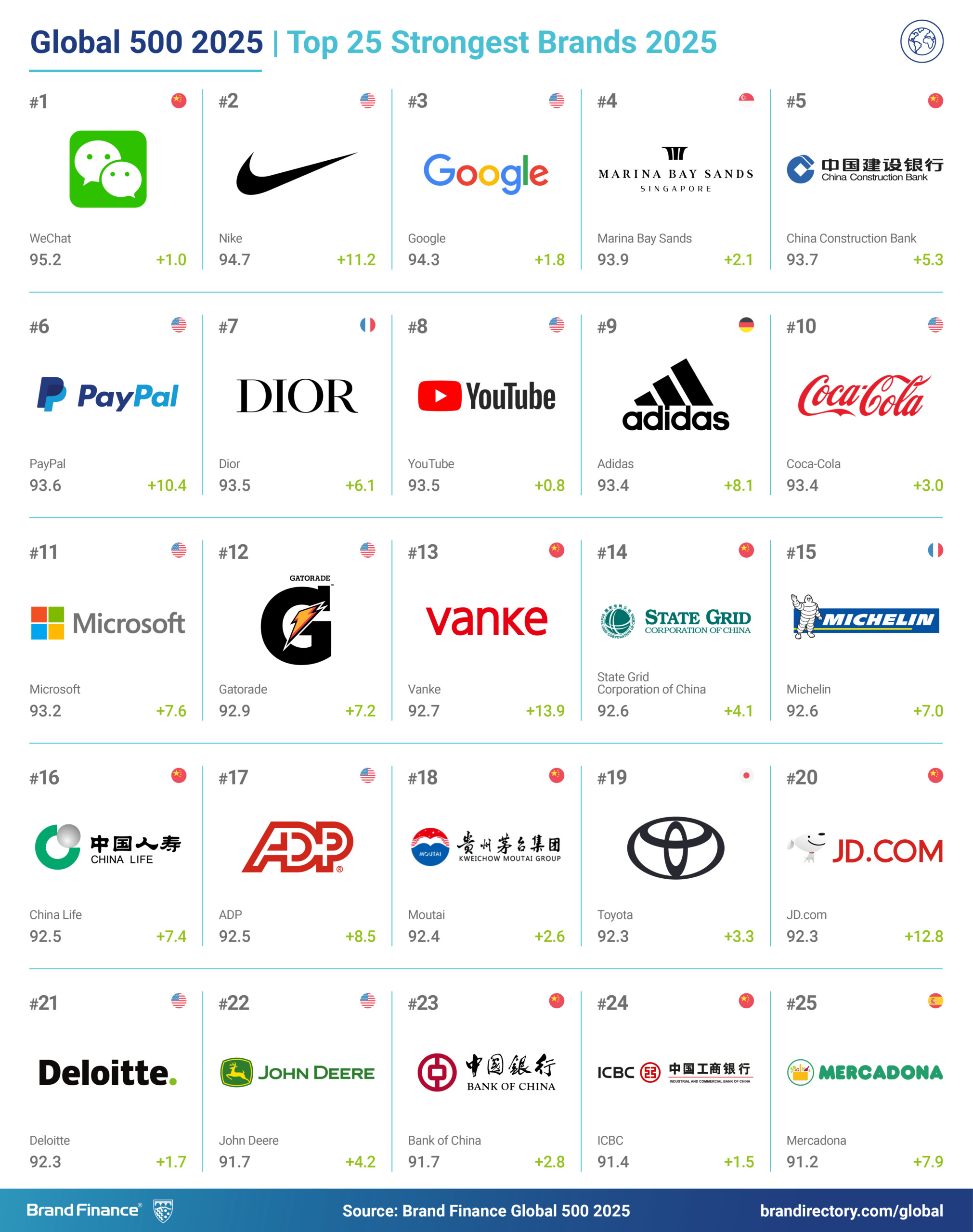 Meanwhile, e& recorded a staggering 701% growth in brand value, reaching USD15.3 billion, driven by a unified brand identity and global expansion. WeChat retained its title as the world’s strongest brand, achieving an unrivalled BSI score of 95.2 out of 100.