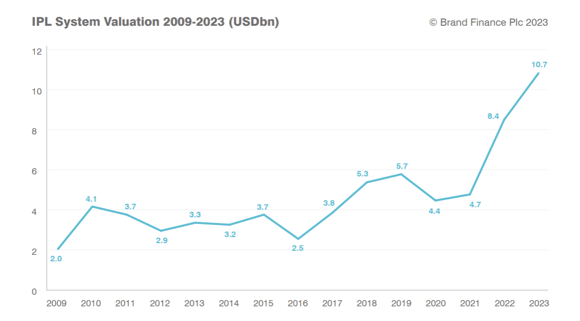 After a bumper 2023 season, the total combined brand value of the IPL System grew 28% to USD10.7 billion, according to a new report from the world’s leading independent brand valuation consultancy, Brand Finance. The total combined brand value of the IPL system has been calculated annually by Brand Finance since 2009, with the latest findings included in the IPL 2023 report.