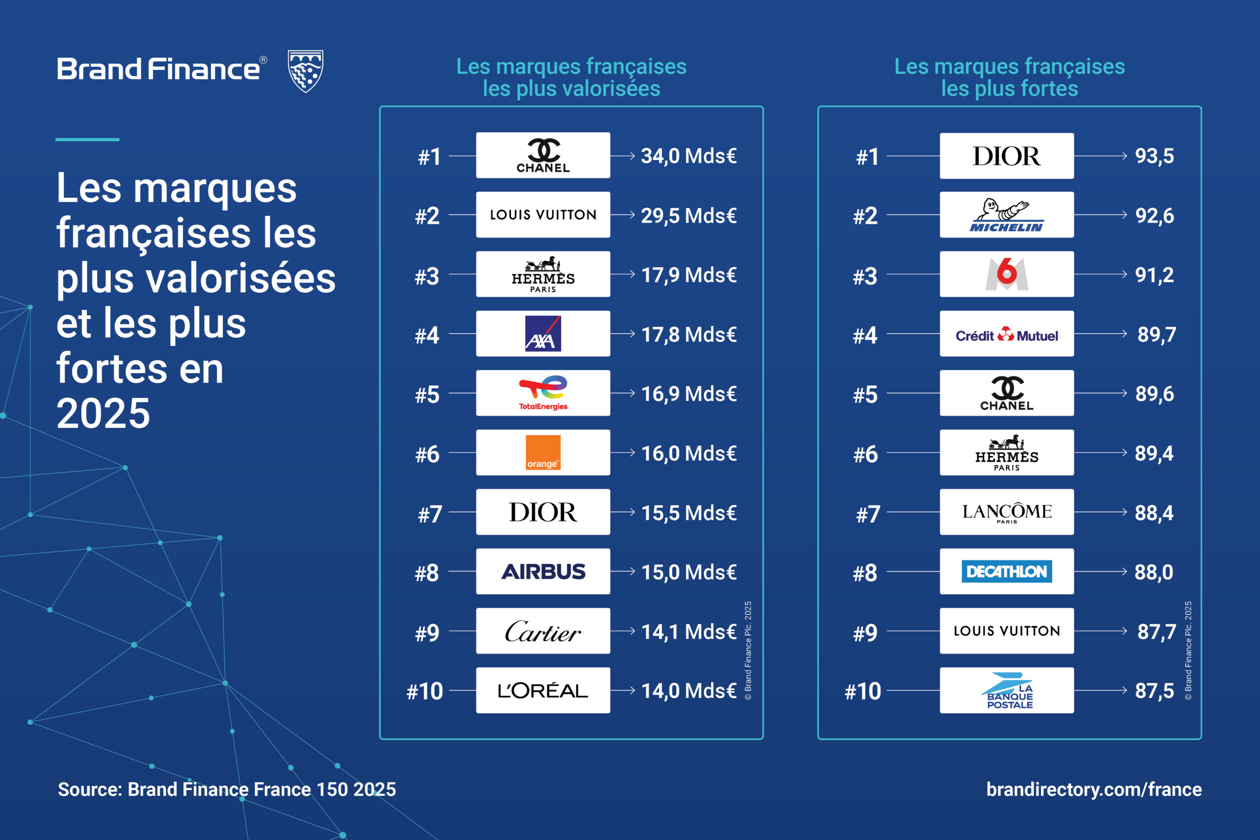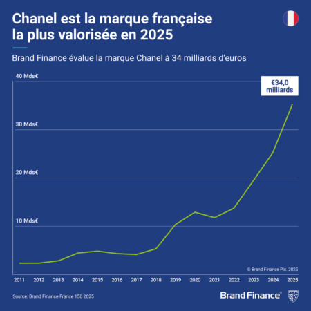 Chanel a dépassé Louis Vuitton pour devenir la marque française la plus valorisée, avec une hausse de 40 % de sa valeur à 34 milliards d'euros. L’Indice de Force de Marque de Chanel a également légèrement progressé, atteignant 89,6/100. En France, Chanel a notamment obtenu la note parfaite de 10 sur la « familiarité », la « considération » et la « satisfaction client, » démontrant ainsi une forte résonance locale et fidélité des clients.