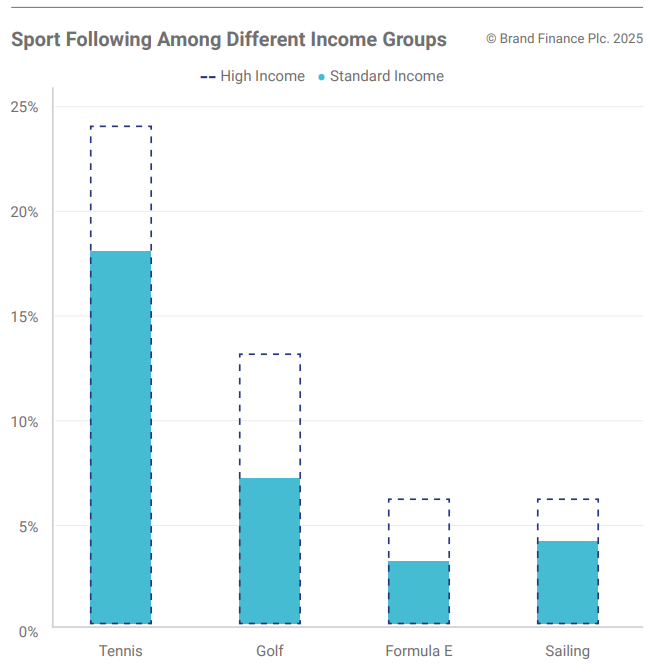 Brand Finance data shows higher income individuals are 78% more likely to follow golf and show increased engagement with sailing (59%) and tennis (29%). When applied to marketing strategies, this increased following translates into real brand uplift.