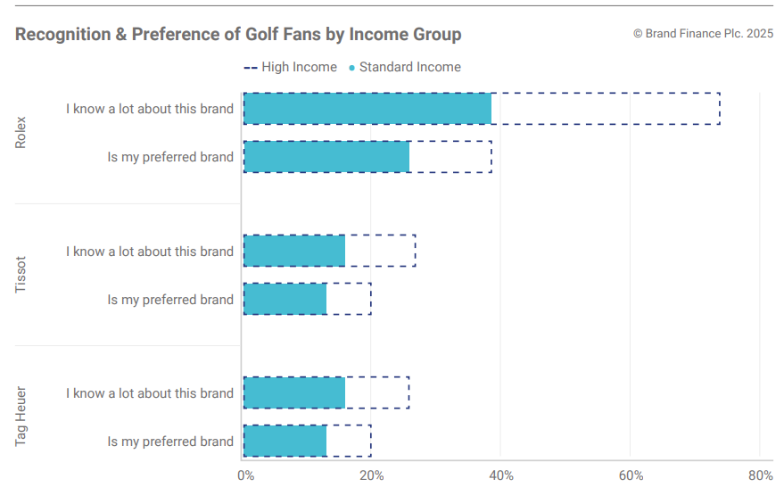 Brand Finance data also shows that, among golf fans, Rolex notes a 36% increase in brand recognition and a 12% increase in preference. By contrast, brands like Tissot and Tag, which don't sponsor golf, see only an 11% increase in recognition and a 7% increase in preference among golf fans. These figures underscore the scale of Rolex’s investment, having entered an estimated USD192.95 million agreement with the PGA European Tour.