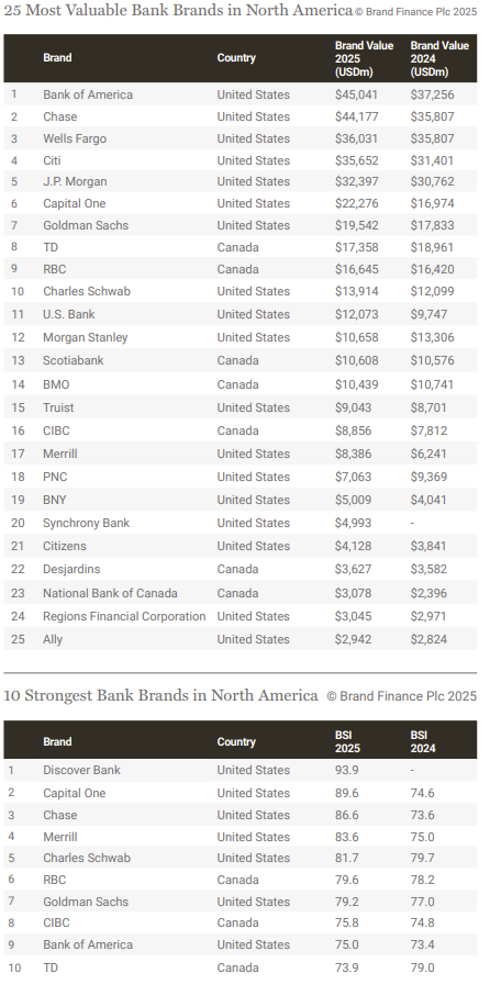 In Canada, TD (down 8% to USD17.4 billion), RBC (up 1% to USD16.6 billion), Scotiabank (unchanged at USD10.6 billion), BMO (down 3% to USD10.4 billion), and CIBC (up 13% to USD8.9 billion) continue to dominate the market, all securing spots in the top 20 most valuable banking brands in North America and the top 50 globally. Canadian brand values have remained relatively steady, especially in comparison to the aggressive growth of their US counterparts.