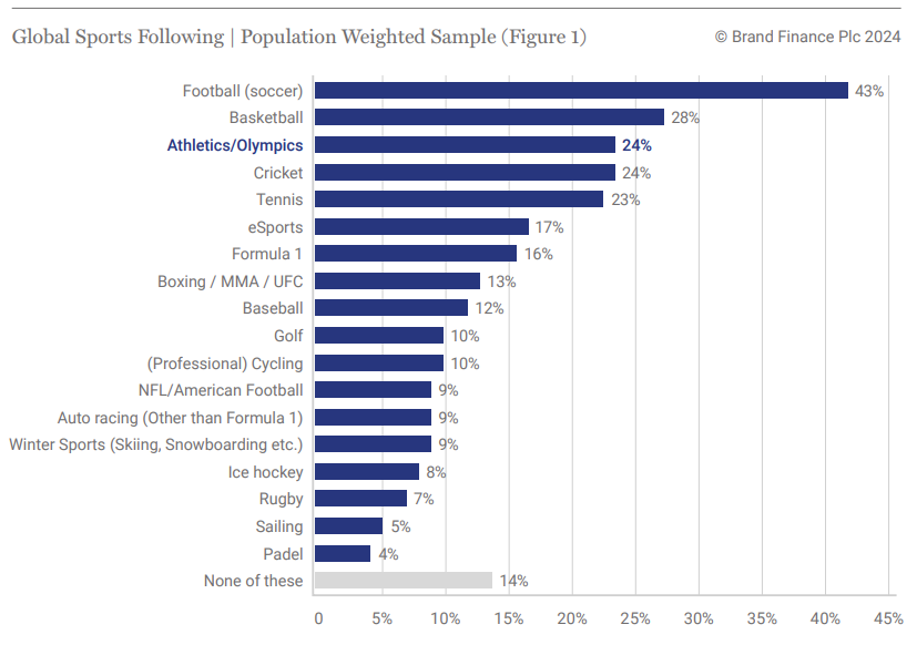 As short form video and the emergence of streaming services intensifies the competition for viewers’ precious time, the Olympics still captures public attention. Brand Finance research reveals that the Olympic games is the third most popular sporting competition in the world, trailing only football and basketball, with basketball propped up by hefty interest from populous US and China (Figure 1).