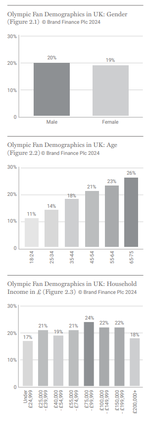 According to Brand Finance data, 20% of adults in the UK say they follow the Olympics, and this group generally skews older and more affluent (Figures 2.1, 2.2, 2.3).