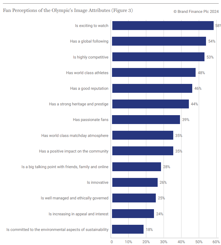 Globally, the Olympics are known for possessing strong reputational qualities (46%) and heritage attributes (44%). However, Brand Finance research shows that only 26% of respondents find that the Games are innovative, with even fewer (18%) finding them to be environmentally sustainable (Figure 3).