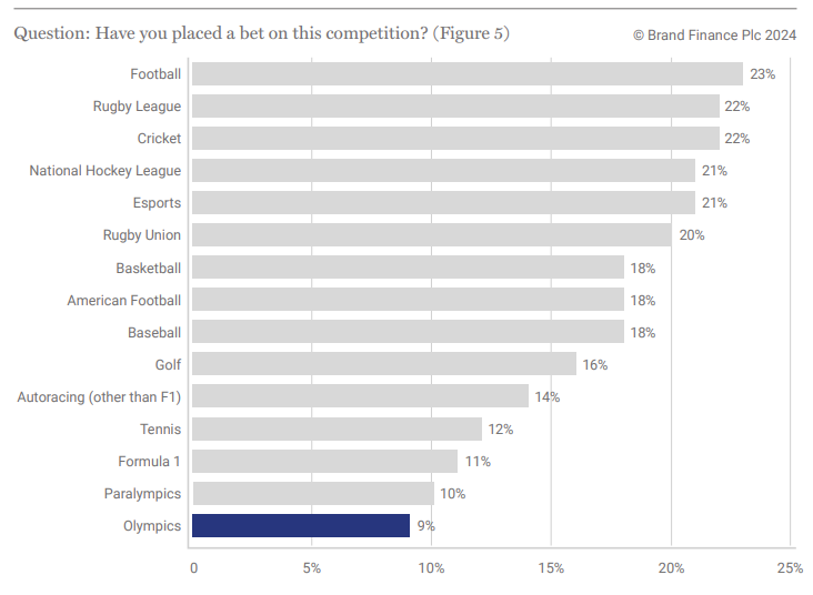 The biggest discrepancy in attributes between the Olympics and the FMWC is the athletes’ and teams’ ability to attract a steady social media following. Football players and clubs appear year-round both on and off the pitch, the 4-year cycle of the Olympics results in much less visibility for the competing athletes during non-Games years. Notable stars such as UK diver Tom Daley have become household names, but most of these athletes are unknown to Olympics fans until they make their event appearances or receive media coverage in the lead up to or during the games. The Olympics are far more popular to watch than to wager. Brand Finance Data reveals fans are least likely to bet on Olympic events than any other sporting events or league included in the research (Figure 5), with only 9% of respondents saying they’ve placed a bet in who gets the gold.