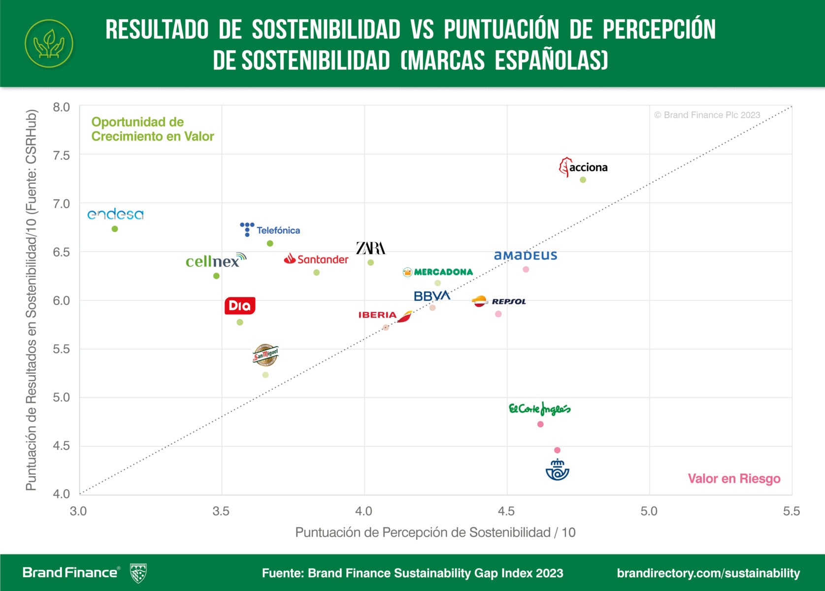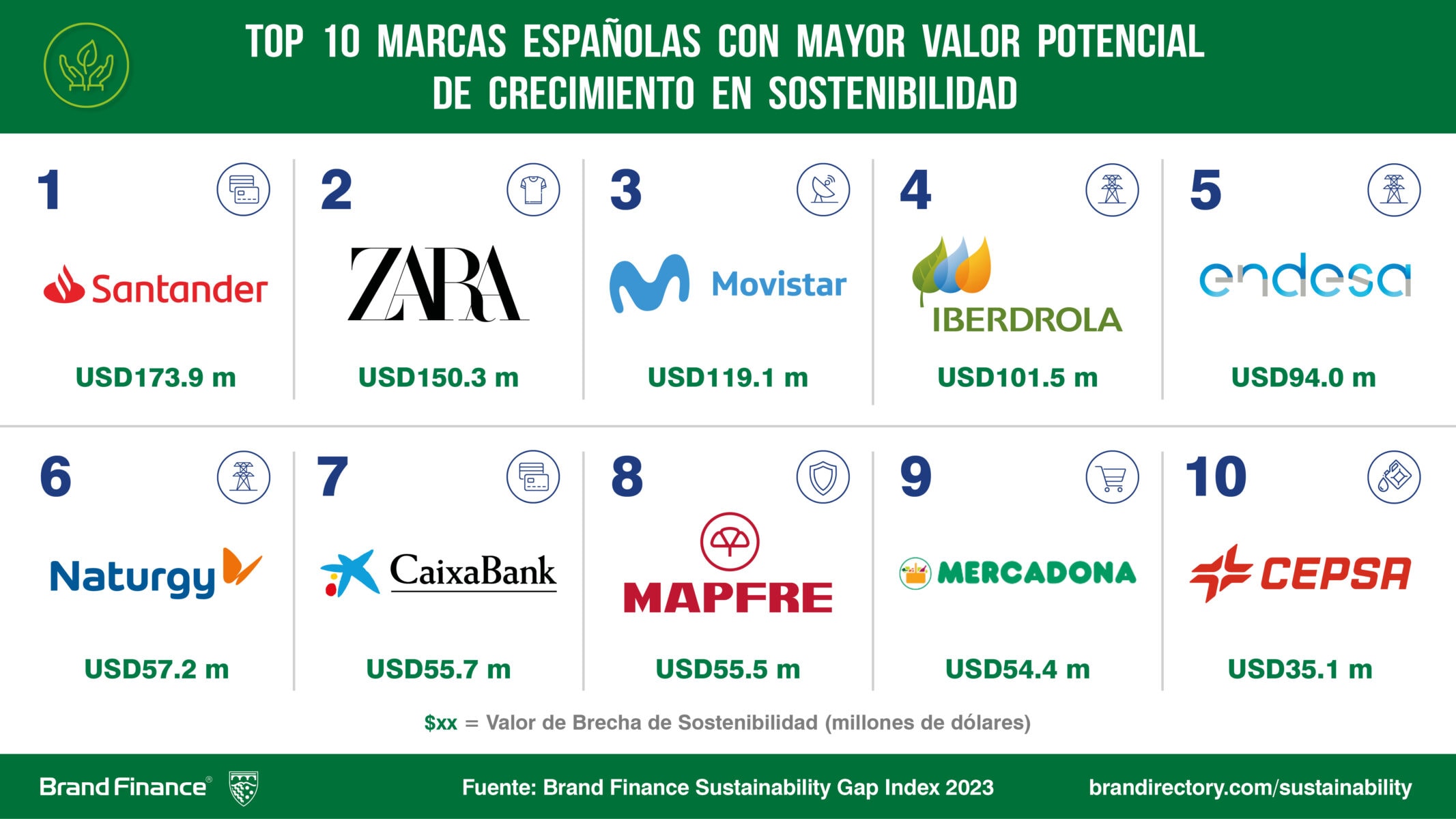 Santander (174 millones de dólares), ZARA (150 millones de dólares) y Movistar (119 millones de dólares), son las marcas españolas con mayor oportunidad de ganar valor mediante una mejor comunicación en sostenibilidad según el primer Informe de Brecha en Sostenibilidad (Sustainbility Gap Index) de Brand Finance, la consultora independiente líder en valoración de marca. Microsoft lidera el ranking como la marca que mayor brecha positiva posee (oportunidad de ganar 1.500 millones de dólares) y Tesla la que más brecha negativa (4.100 millones de dólares en riesgo).