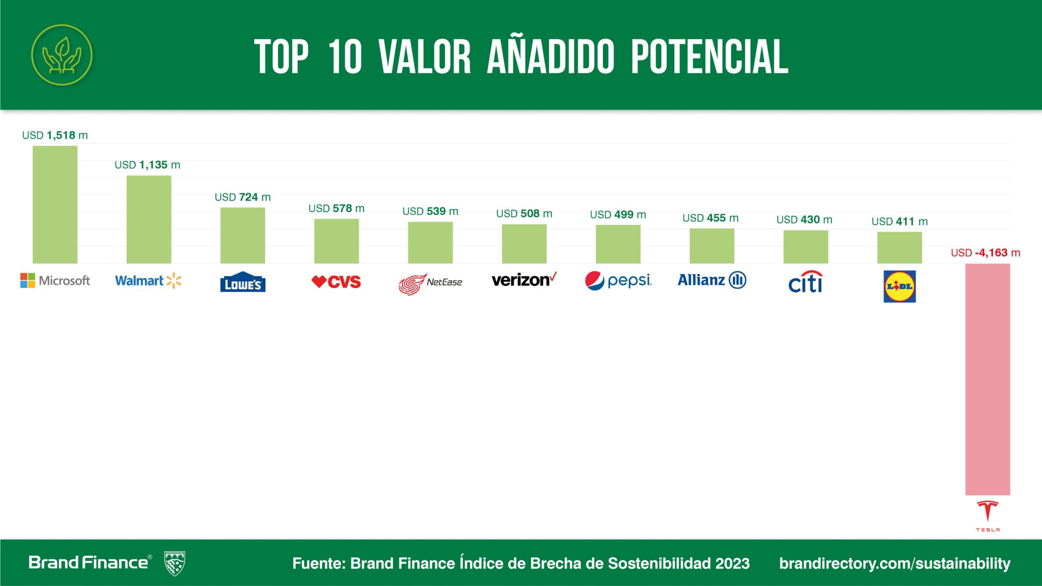 Por el contrario, Microsoft tiene el mayor valor de brecha positiva de todas las marcas según la investigación de Brand Finance: 1.500 millones de dólares. Esto revela que los resultados de sostenibilidad de Microsoft superan su percepción de sostenibilidad, lo que significa que Microsoft tiene la oportunidad de generar hasta 1.500 millones de dólares mediante una mejor comunicación de sus iniciativas y servicios de sostenibilidad.