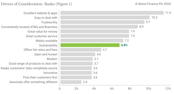 In retail banking, our research shows that sustainability drives 6.8% of brand consideration, relative to other attributes. Globally, it is the eighth most important attribute, as shown in Figure 1.