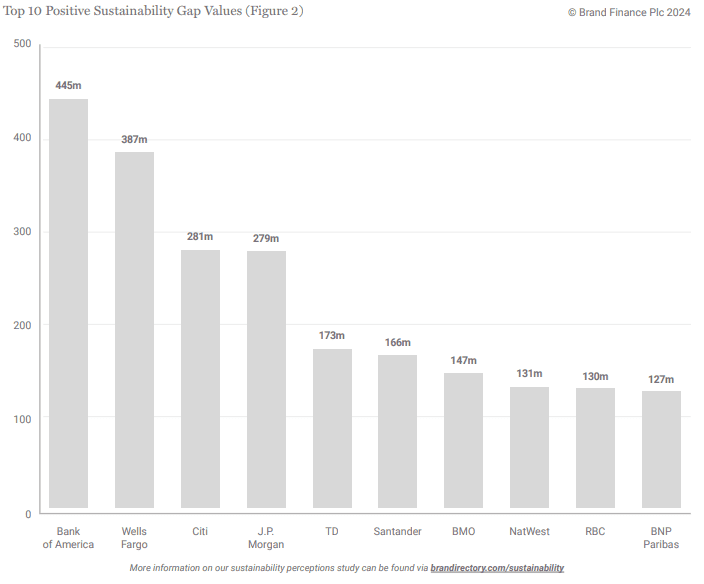 Figure 2 depicts the top 10 largest positive gap values for banking brands in the latest Sustainability Perceptions Index.