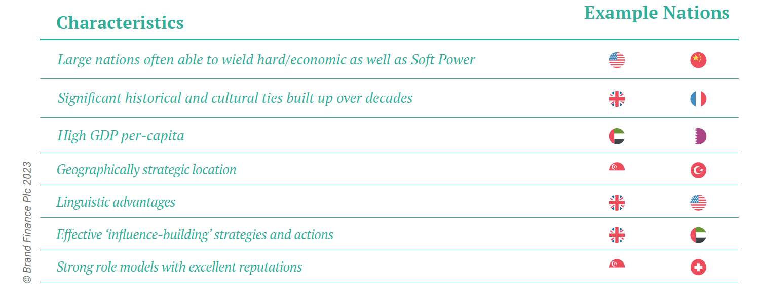 Influence is not easily earned, but there are steps that nations can take to build it. Nations which punch above their weight for Influence typically have one or more of these characteristics listed in the table below.
