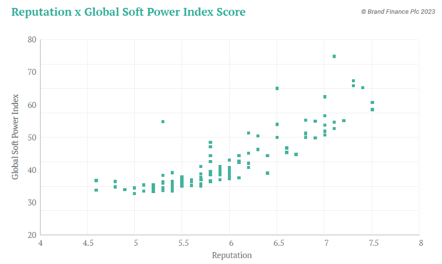 Israel, China, Saudi Arabia, UK, and USA are other examples of nations whose Soft Power rankings are not a merely a function of having a ‘perfect’ Reputation.
