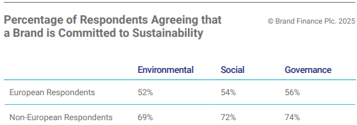 European respondents are 28% less likely than people living outside of Europe to agree that brands are committed to environmental sustainability. The difference for social sustainability is equally high (28%), and Europeans are 27% less likely to agree that brands are well-managed and governed.