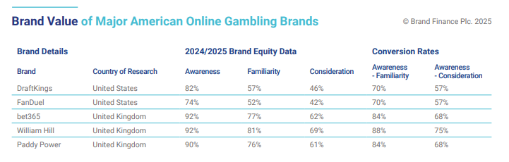 Whereas FanDuel (74%) and DraftKings (82%) have increased awareness in the US in each of the past 3 years, this still trails that of bet365 (92%), William Hill (92%) and Paddy Power (90%) in the UK.