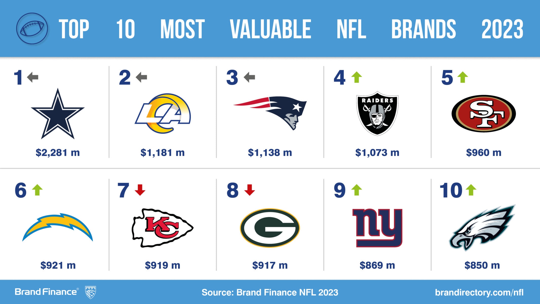 The Los Angeles Chargers surge into the top 10 following a 45% brand value increase
