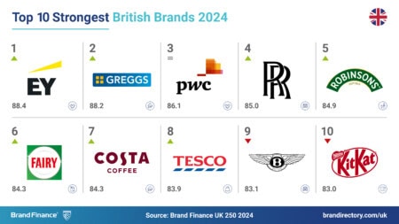 Shell reinforces its title as the UK’s most valuable brand, recording a 1% increase in brand value to GBP40.3 billion. This is particularly notable given the backdrop of falling revenues, a decline in enterprise value, and a drop from an AA+ rating to AA in terms of brand strength. EY (brand value up 16% to GBP24.7 billion) has maintained its standing as second most valuable UK brand and has now emerged as the nation’s strongest brand. EY’s growth contrasts rival UK Big Four brands PWC (brand value down 6% to GBP19.8 billion) and KPMG (brand value down 8% to GBP11.4 billion), ranked third and seventh, respectively.