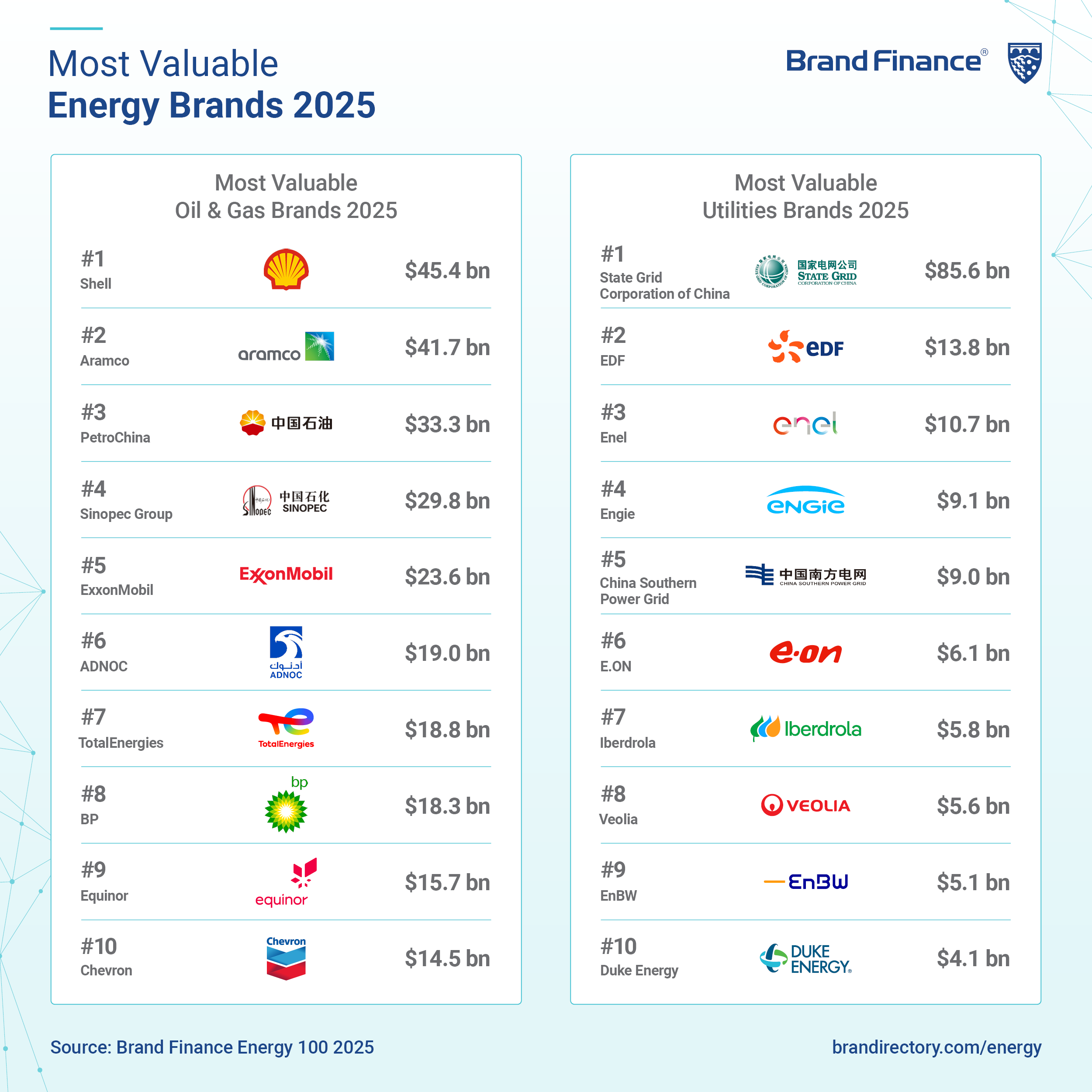 Brand Finance’s inaugural Energy 100 report ranks the most valuable and strongest oil & gas as well as utility brands for 2025